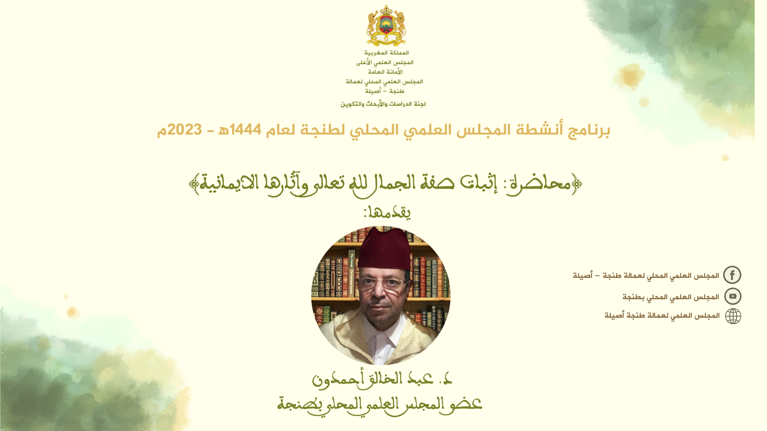 محاضرة: “إثبات صفة الجمال لله تعالى وآثارها الايمانية” للدكتور عبد الخالق أحمدون عضو المجلس العلمي