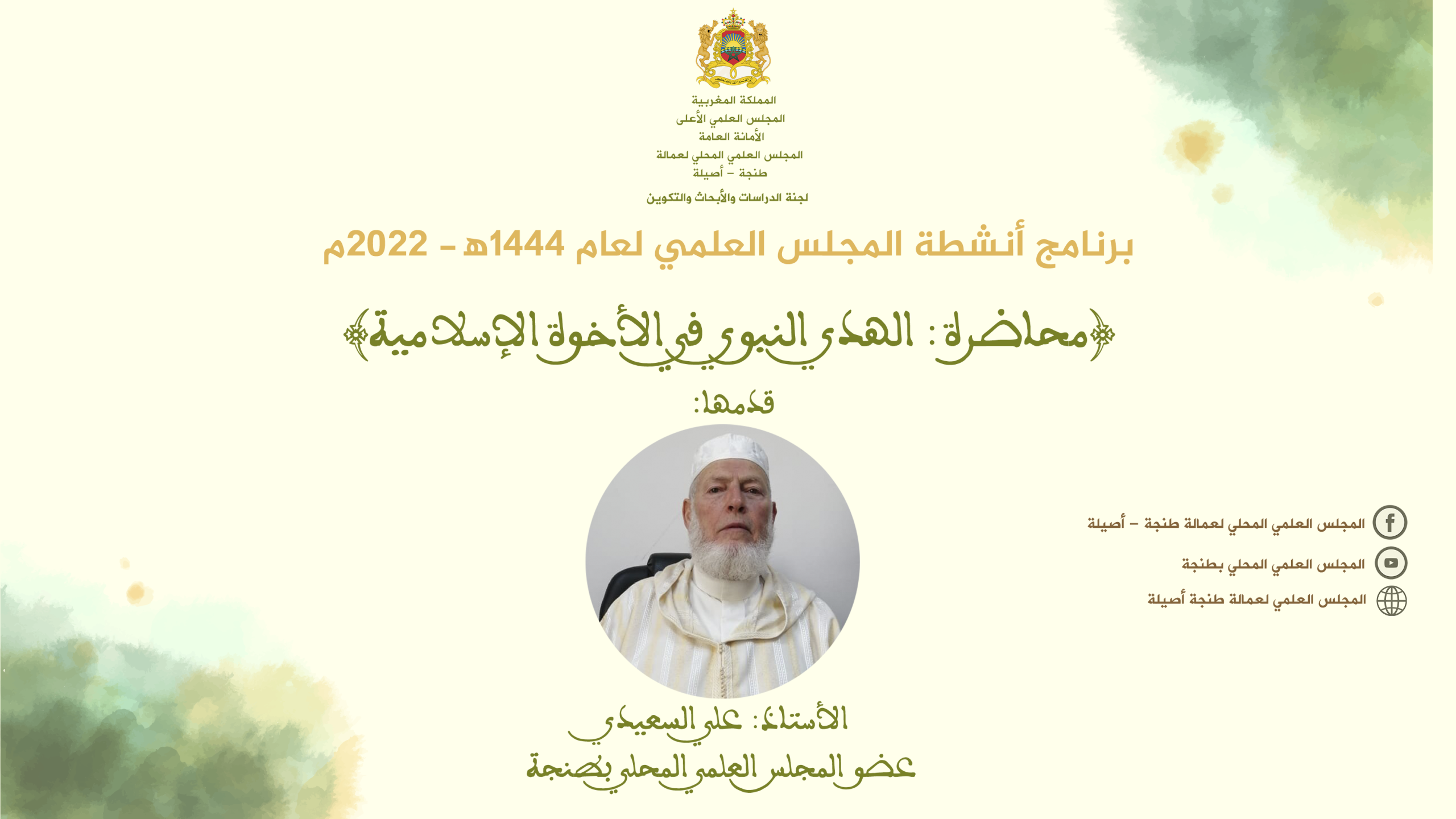 ينظم المجلس العلمي المحلي لعمالة طنجة أصيلة في إطار برنامجه الثقافي محاضرة بعنوان:” الهدي النبوي في الأخوة الإسلامية” يقدمها الاستاذ علي السعيدي عضو المجلس العلمي المحلي
