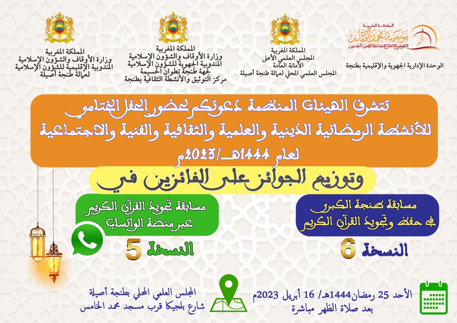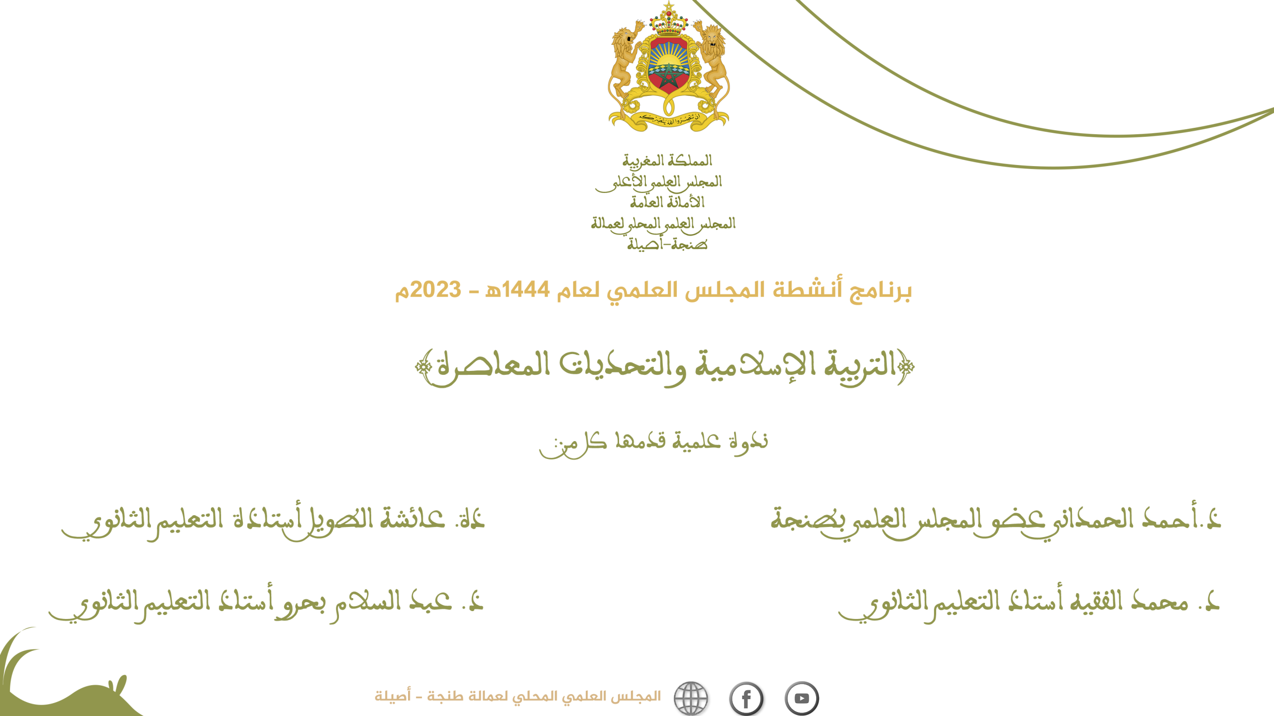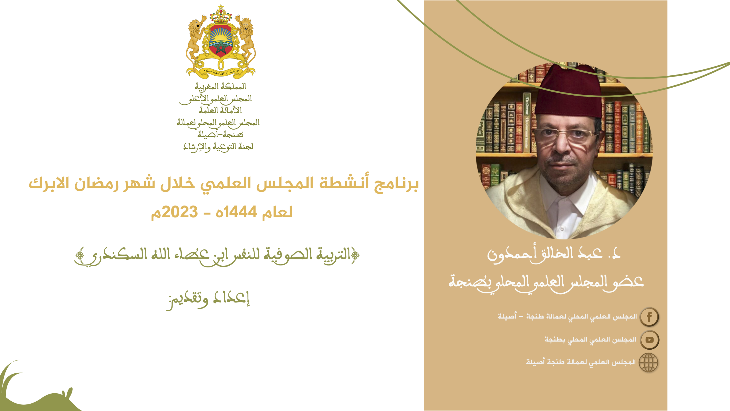في إطار أنشطة العلمية والدينية يقدم المجلس العلمي المحلي لعمالة طنجة أصيلة محاضرة علمية في موضوع: “إثبات صفة الجمال لله تعالى وآثارها الايمانية” يقدمها الدكتور عبد الخالق أحمدون عضو المجلس العلمي. وذلك يوم الثلاثاء 25 شوال 1444ه الموافق 16 ماي 2023م بقاعة المجلس العلمي